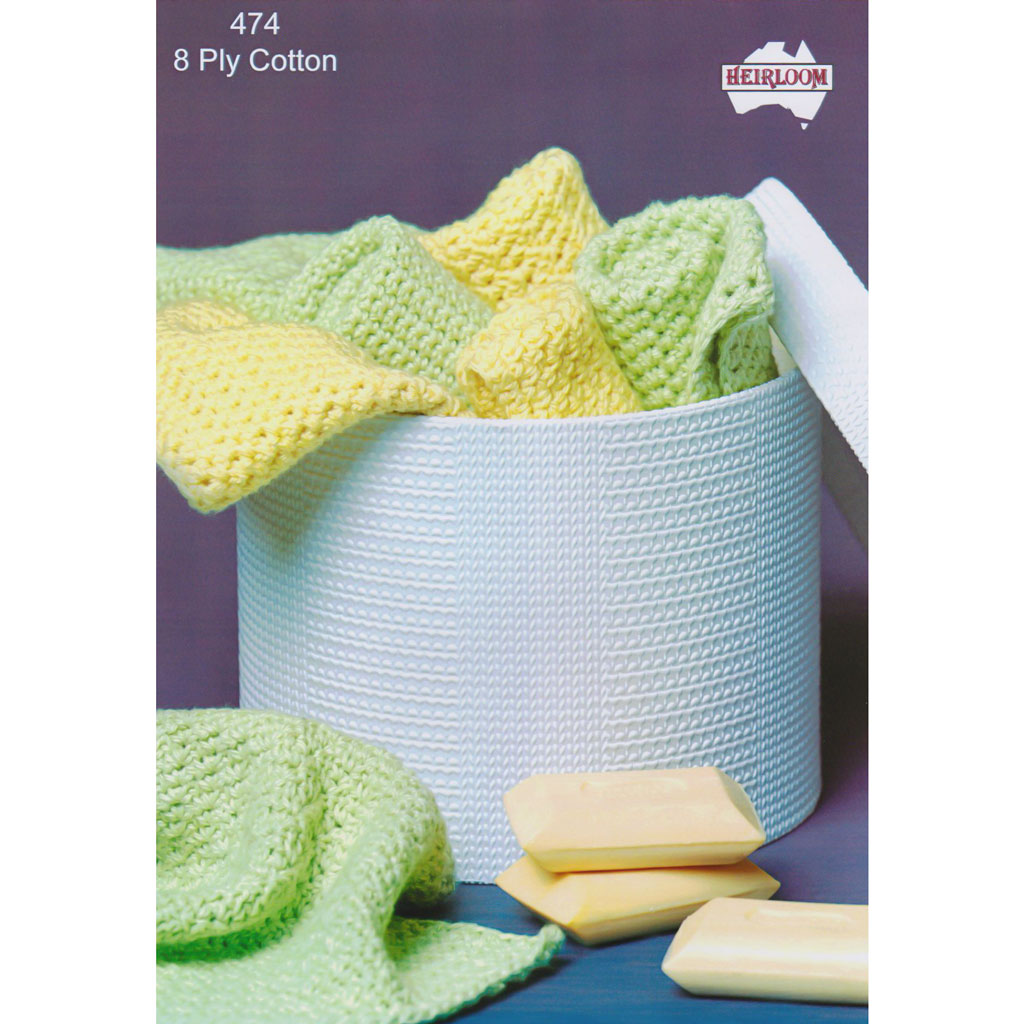 8ply Cotton - 4 Washcloths to Crochet Heirloom 474 Crochet patterns for 4 different washcloths using 8ply cotton yarn. Each cloth requires 1 ball of Heirloom 8ply cotton. You will also need a 4mm crochet hook. Finished washcloths measure 20cm x 20cm. sold out $4.95