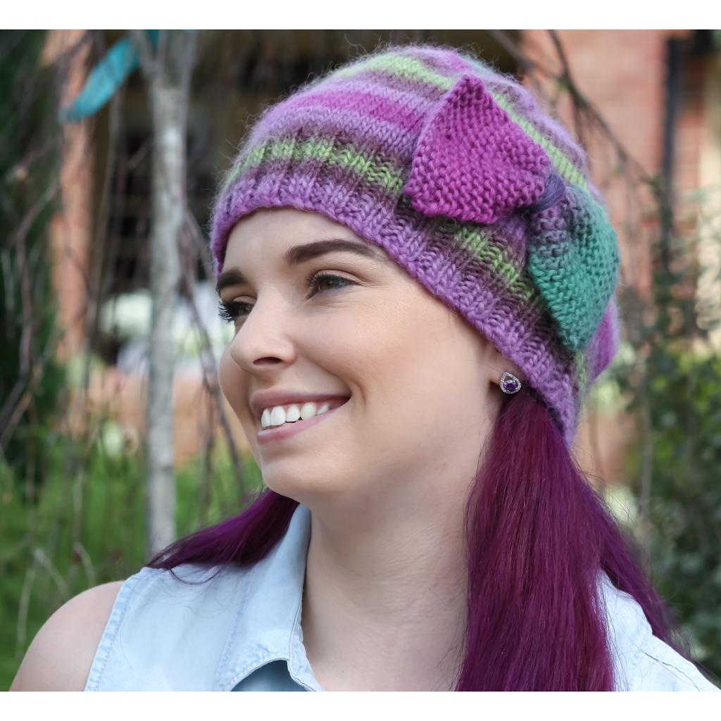 The perfect beginner beanie project in pure self-striping or plain wool yarn. Roll the brim down for modern styling (as pictured), or turn it over for a traditional look. Add a decorative bow if that suits your style, or leave it off and choose a men's shade to craft a men's beanie. The decorative bow pattern could also a make a great accessory or gift topper. Wear your beanie with a neutral coloured coat to add a splash of colour, or match one of the stripe shades to your outfit to balance your look from head to toe.
