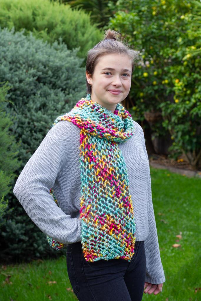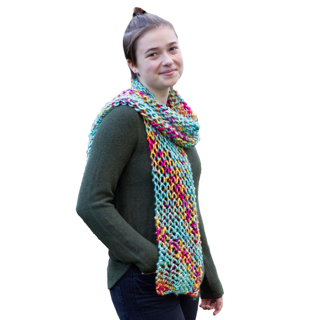* Our Chunky Merino Scarf in Fiori Grande has been knitted in Shade Rainbow.