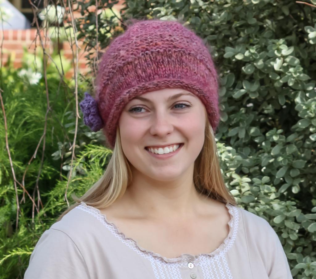 Pictured: our Mohair Cap in Sunrise. (Note: purple flower brooch is a styling suggestion - not included in kit)