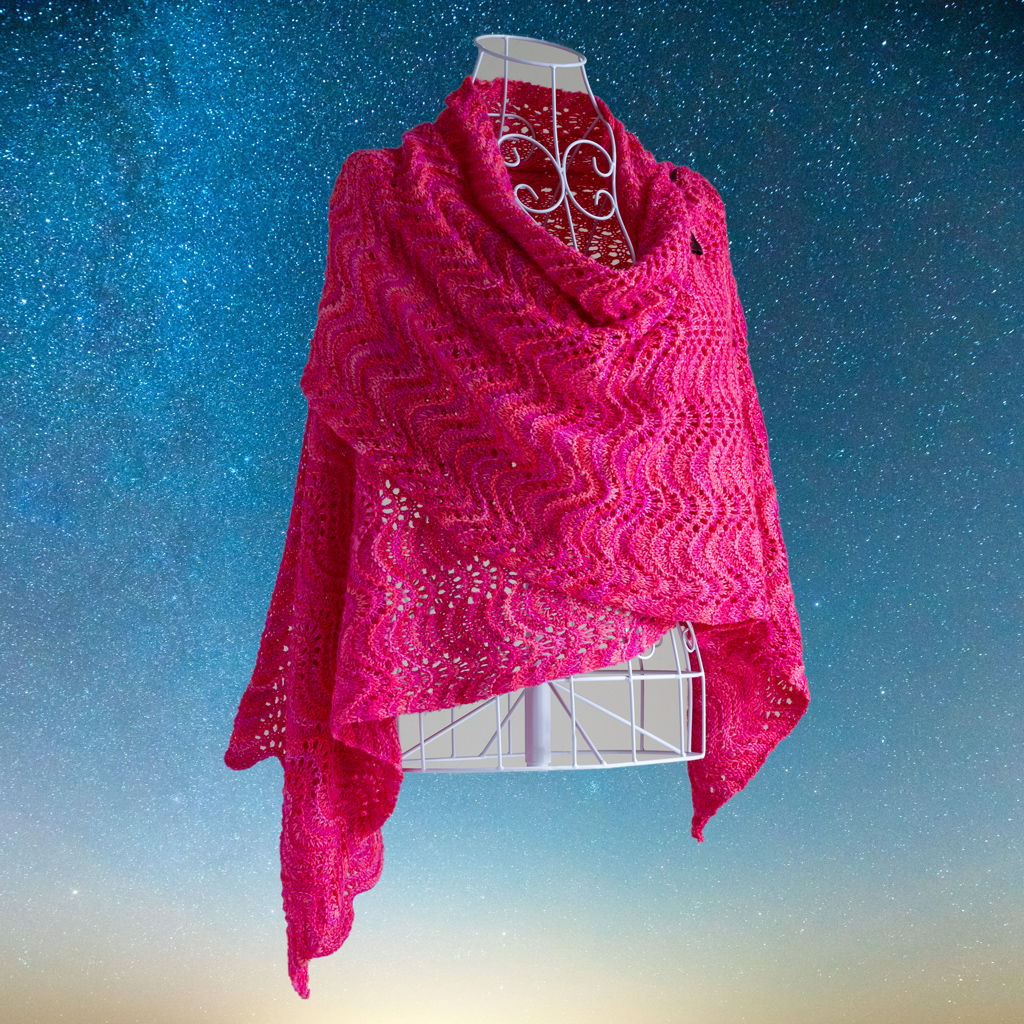 Soft and luxurious pure merino meets watercolour colourways, perfectly complementing the delicate lacy pattern of this stunning shawl.  The open weave and light weight will keep you comfortable on cool Summer nights or throughout Autumn or Spring days.