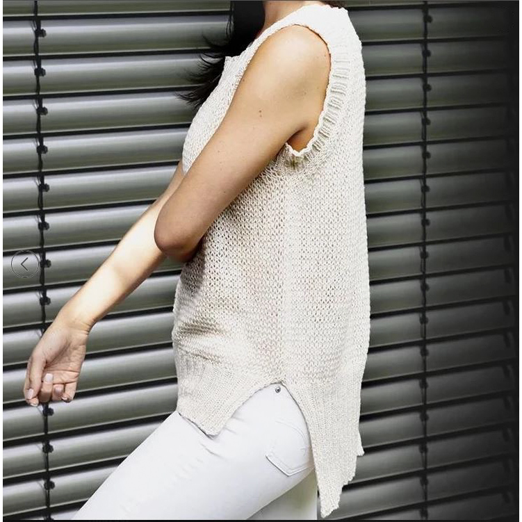 Sleeveless top in luxurious silk/cotton blend Papyrus yarn, perfect for warm weather knitting. An intermediate knit.